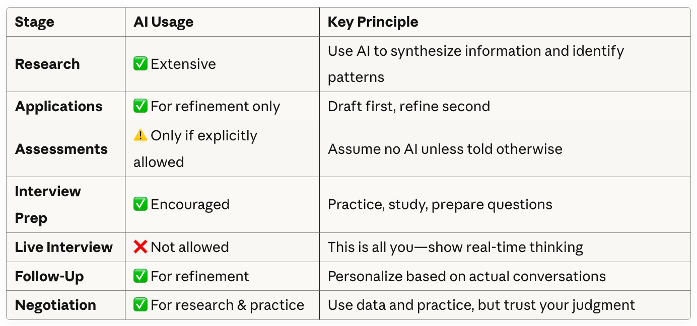 This isn’t about memorizing what AI told you. It’s about demonstrating the skills you’ve honed through AI-assisted preparation. Your preparation becomes internalized knowledge and confidence.