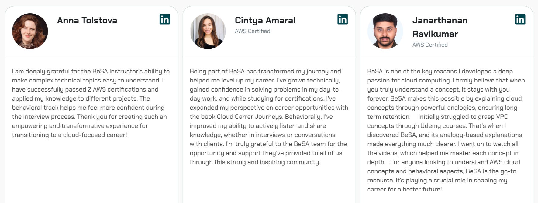So we five had meetings in late 2021/early 2022 that became BeSA. The idea was simple: help people excel in their cloud career and become Solutions Architects by upleveling them on both technical and behavioral skills.