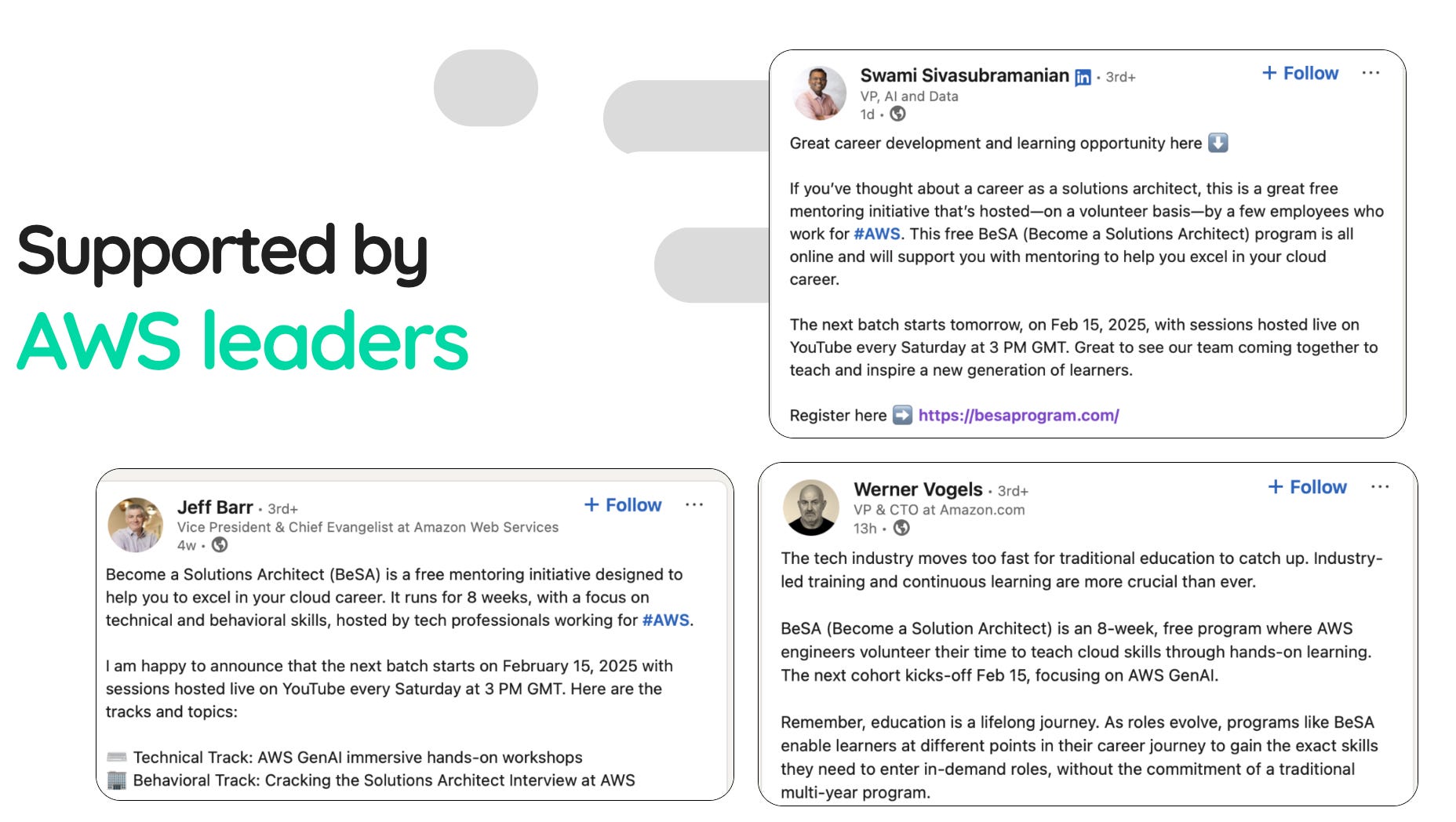 The support from AWS leadership has been incredible. Jeff Barr, Chief Evangelist, AWS has been a long-time champion for BeSA, and starting last batch, we even have support from leaders like Werner Vogels, CTO, Amazon and Swami Sivasubramanian, VP, Agentic AI, AWS.