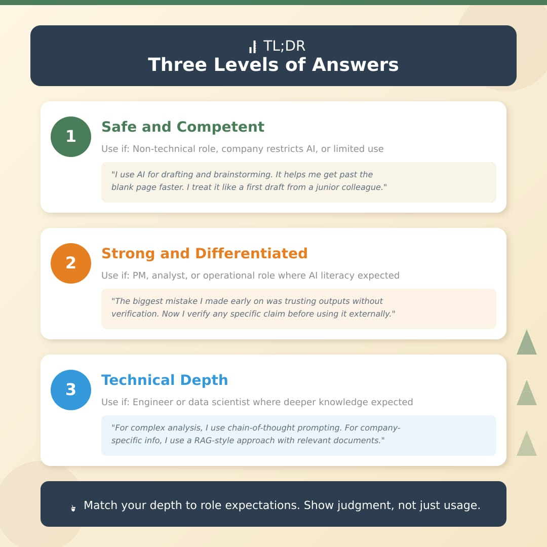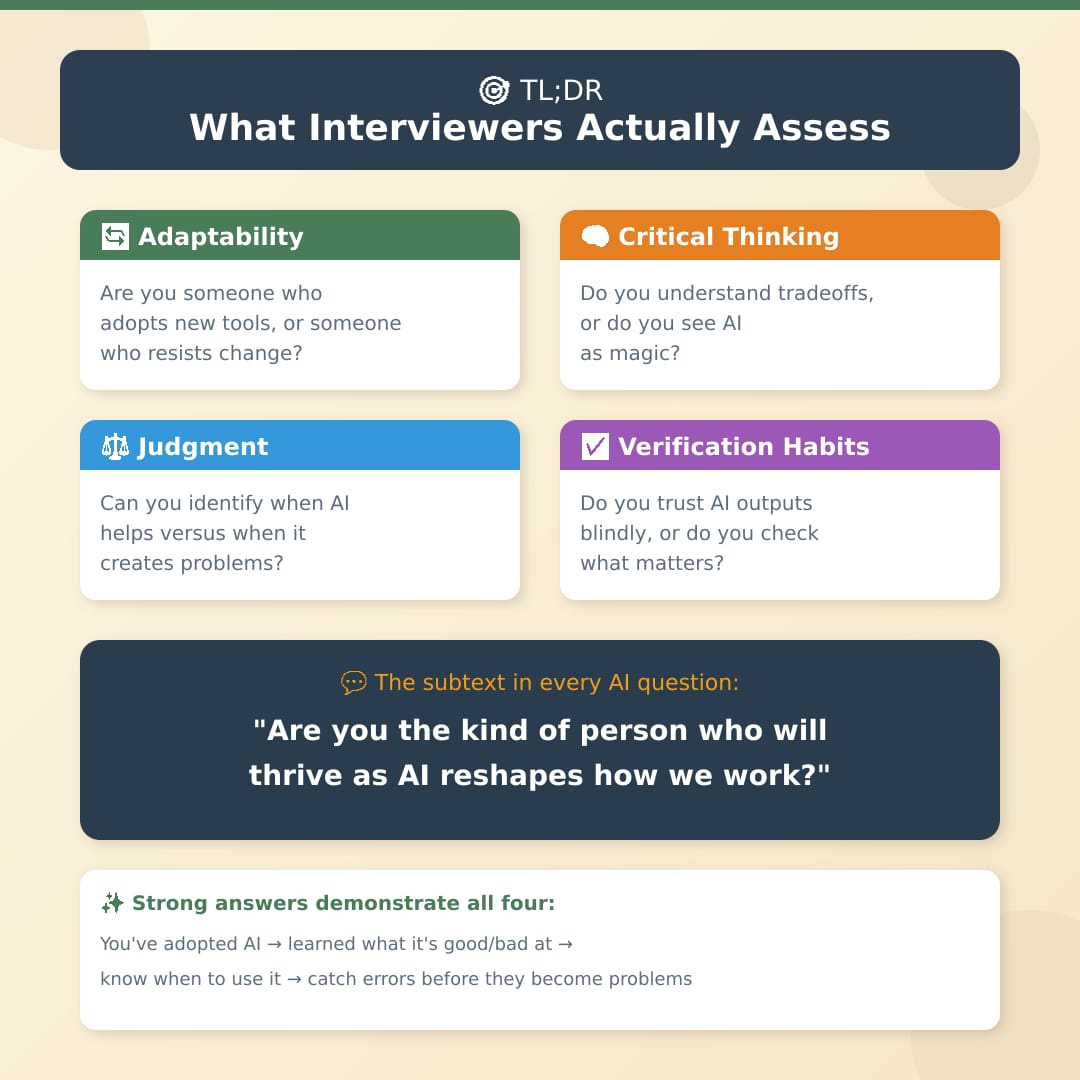 Strong answers demonstrate all four. You’ve adopted AI (adaptability), you’ve learned what it’s good and bad at (critical thinking), you know when to use it and when not to (judgment), and you catch errors before they become problems (verification).