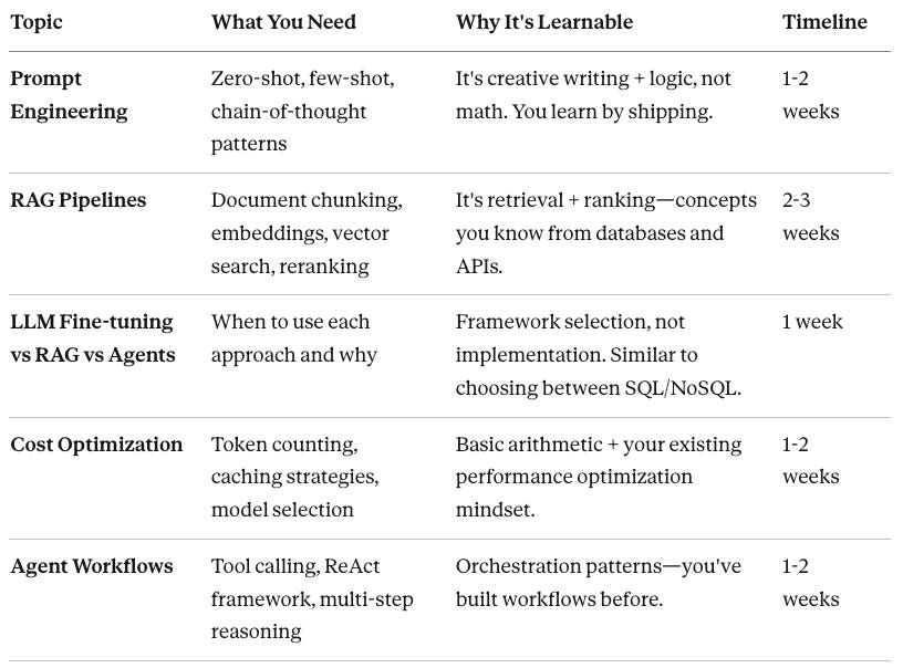 The knowledge gaps are real but narrow. LLMs are new, but the patterns—retrieval, caching, observability, authentication—are old. You know these.