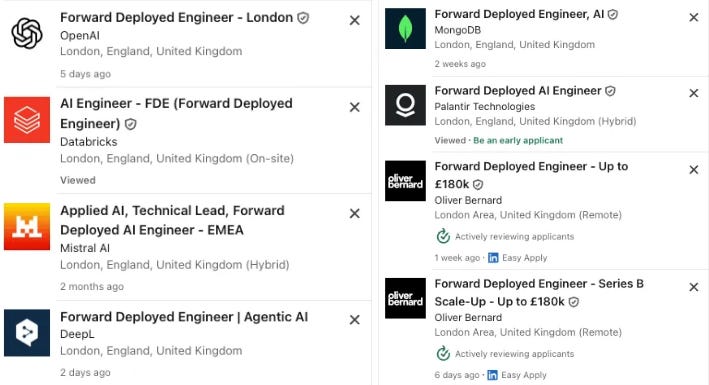 A LinkedIn search for AI FDE roles shows hundreds of roles in the London area alone from companies of all sizes.