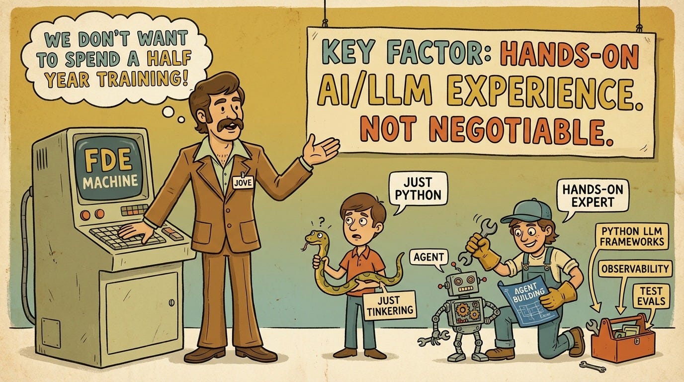 This is the opposite of the typical “secret interview tricks” mindset. The FDE space needs talent, and the best way to find it is to be clear about what you’re looking for.