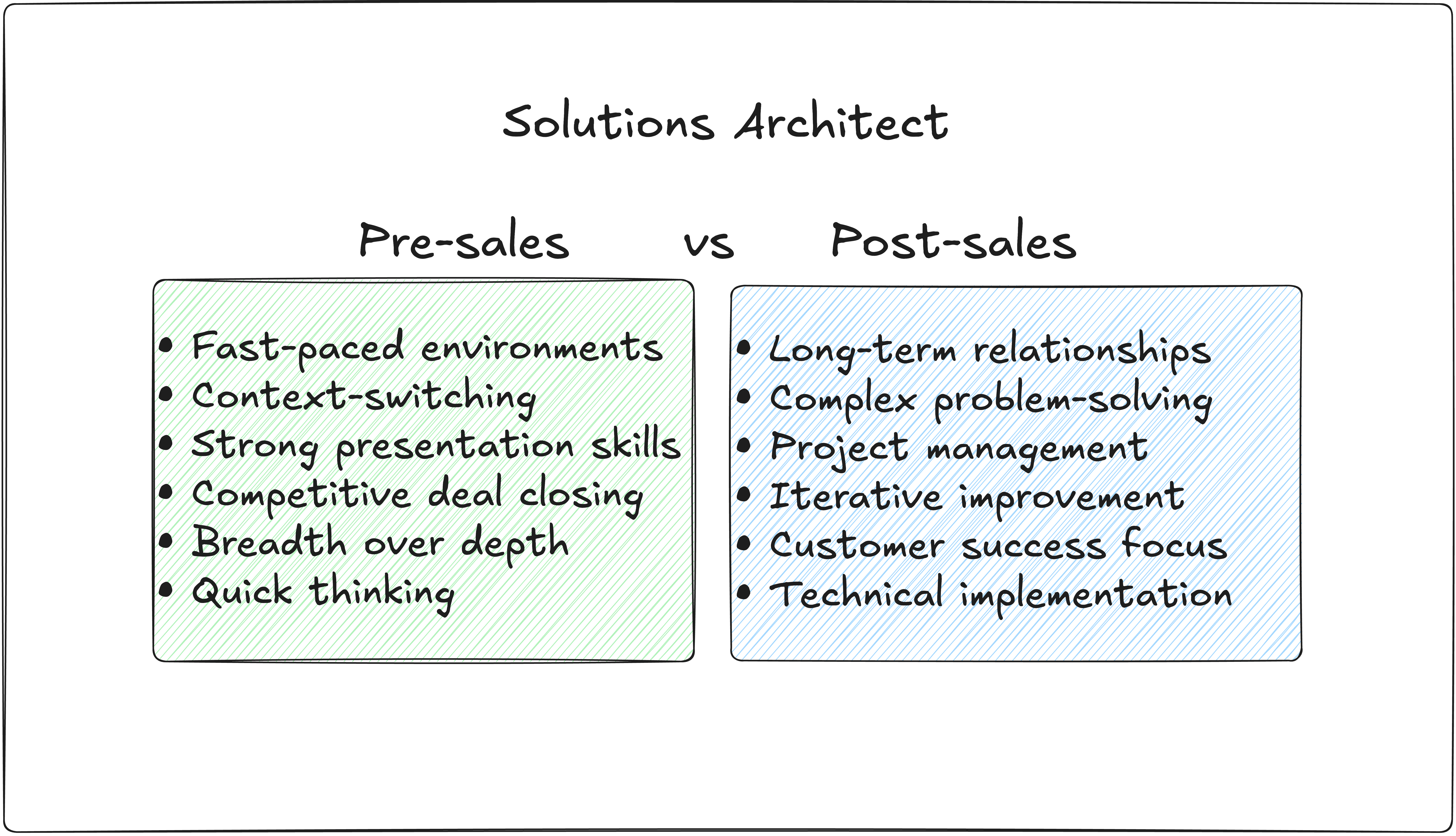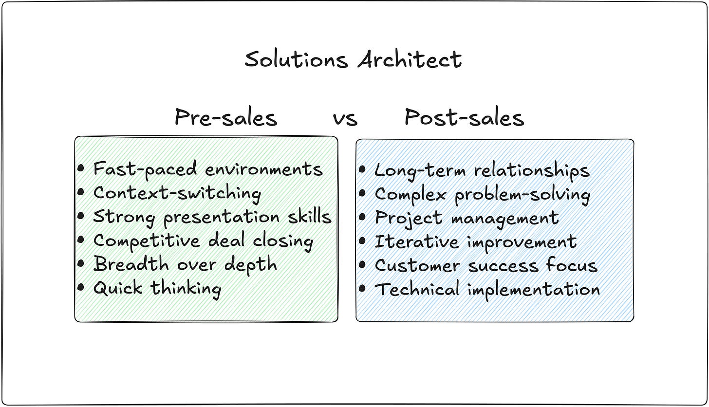 The truth is, the distinction between pre-sales and post-sales Solutions Architects isn't just about timing in the customer journey - it's about fundamentally different skill sets, mindsets, and success metrics. Understanding these differences is crucial for anyone serious about excelling in Solutions Architecture.