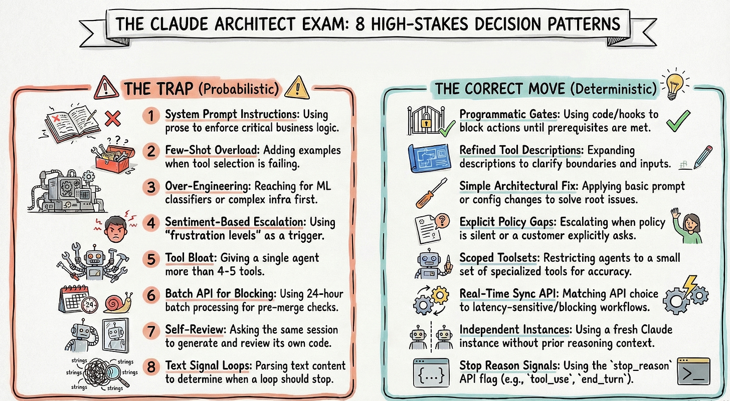 The Claude Certified Architect exam centers on one core skill: selecting the right architectural decision when three of the four options seem valid. The incorrect choices appear reasonable and often reflect what a strong engineer might choose in a slightly different context. The exam targets the gap between understanding a concept and applying it correctly under pressure when multiple answers feel defensible.