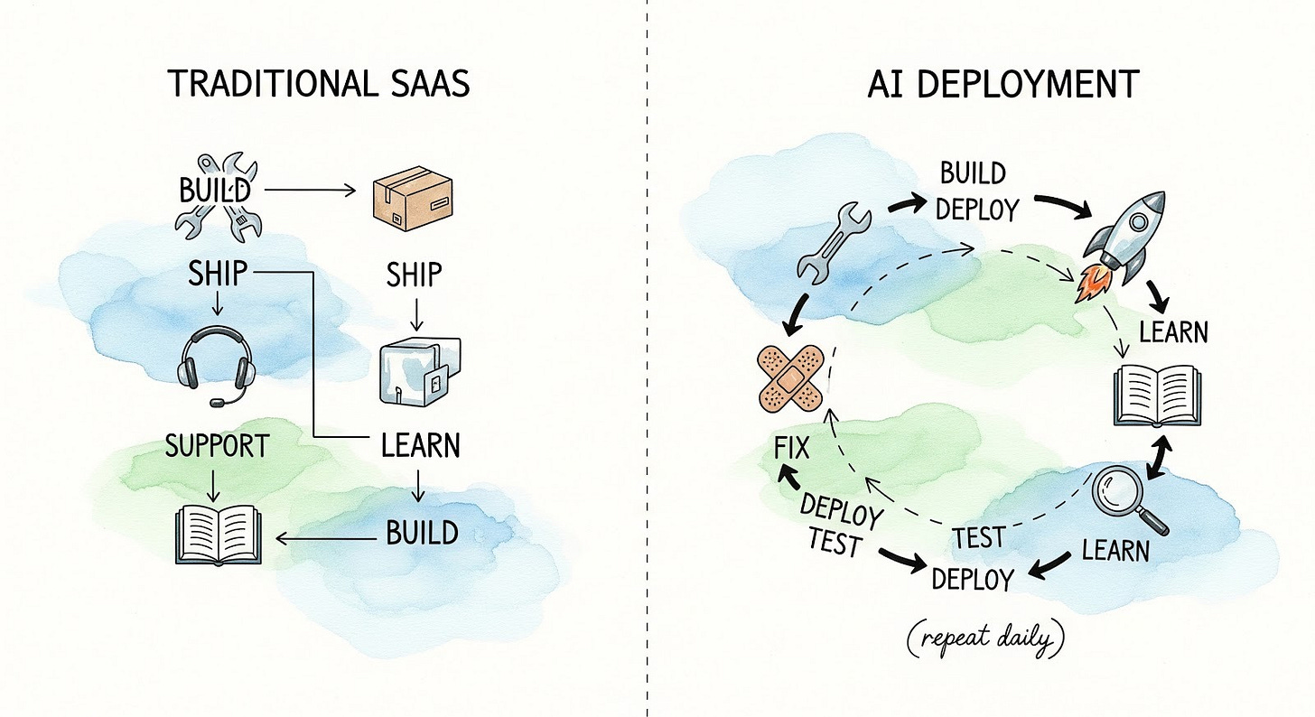AI deployment: Build → Deploy → Learn → Fix → Test → Deploy → Learn (repeat daily)